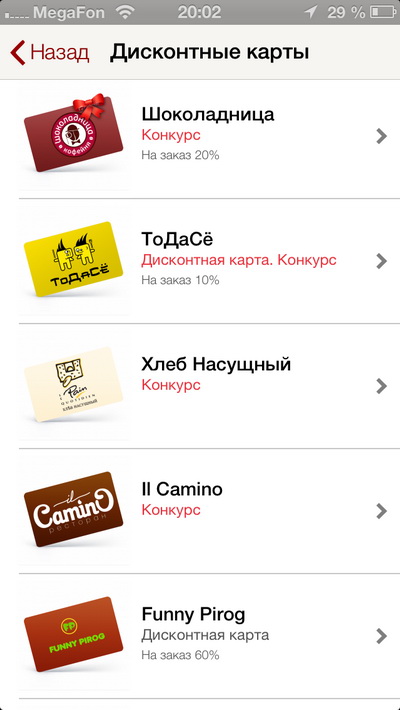 Ну и наконец - о скидках. Вещь очень полезная, ведь носить с собой пачку дисконтных карт неудобно, да и в нужный момент их под рукой, конечно же, не оказывается. Здесь же – всё всегда с собой, в вашем смартфоне. Открыли приложение, нашли карту, показали официанту – и получили скидку.