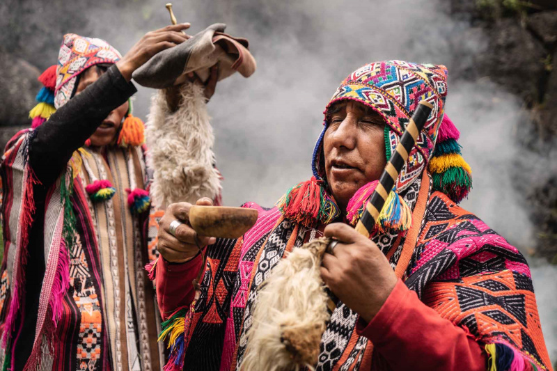 На вершине холма шаманы, одетые в традиционные андские одежды, приветствовали наступающий год в церемонии очищения, включающей цветы, благовония, змею и фотографии президентов Украины и России.