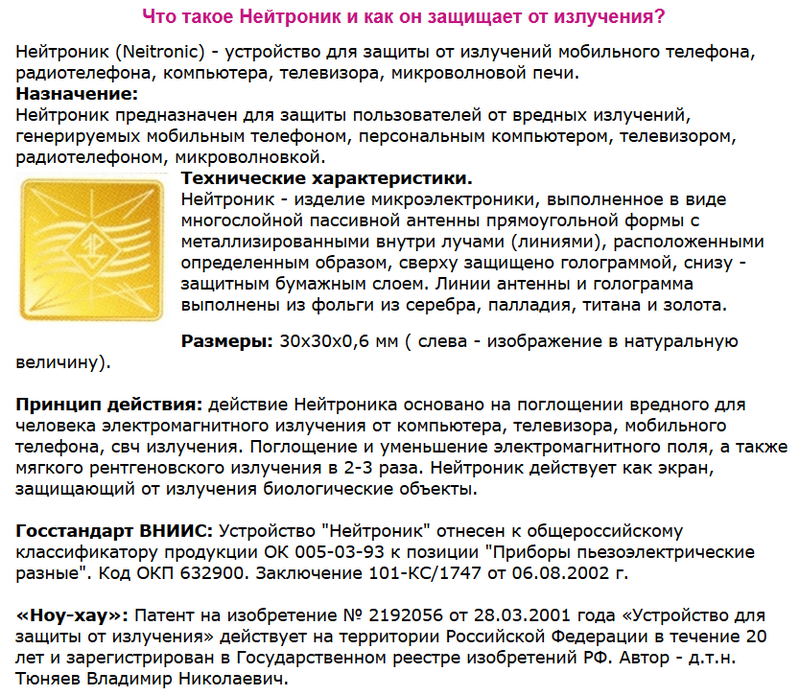 Заметьте, что на это фуфло еще и патент выдали, причем так и написали - "Устройство для защиты от излучения". А если я в этот Государственный реестр шапочку из фольги принесу и скажу, что это "устройство для защиты от излучения" - дадут мне патент или нет?