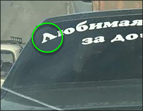 Цвет для надписи автор поленился изменить, хоть чуть-чуть. Поменял шрифт, но не поменял цвет. Стекло у этой машины расположено под углом, надо бы сделать "наклон" текста - но нет, автор просто лепит Times New Roman Bold как на забор.