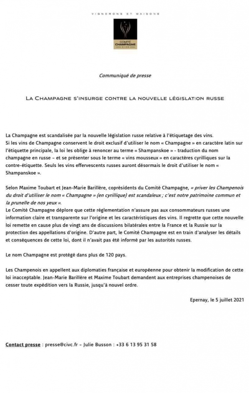 2. Регулирующий орган Шампани опубликовал письмо, в котором заявил о недопустимости сложившейся ситуации, видимо тоже смотрят российский телевизор. Перевод в комментариях или включите сами Google Lens на телефоне, он за секунду переведёт. Не идеально, но вполне читабельно.