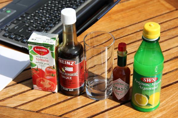 Это, если не ошибаюсь, коктейль Virgin Mary. Хороший коктейль. Вот только где бы вустерский соус взять. Кто-нибудь знает, где он продается?