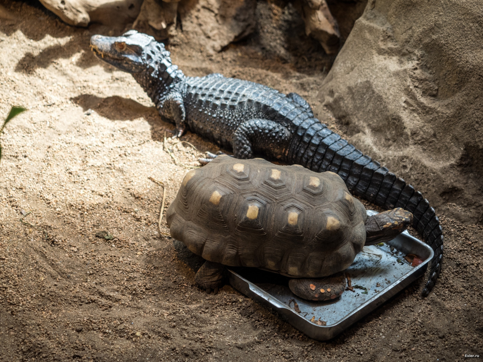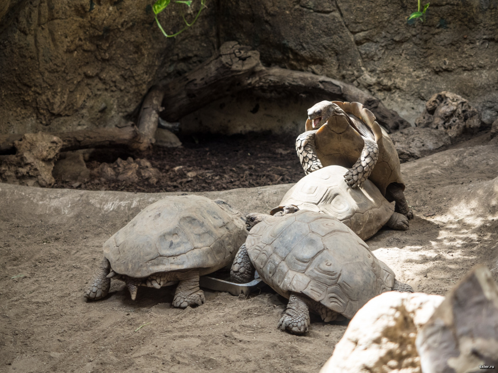 Половые контакты черепах настолько неторопливы, что самка успевает погулять, поесть, поспать - а самец все занимается своим делом, забавно гримасничая. "Слышь, парень, да кончай уже это дело, дай поспать после обеда" - как бы слышат посетители зоопарка.