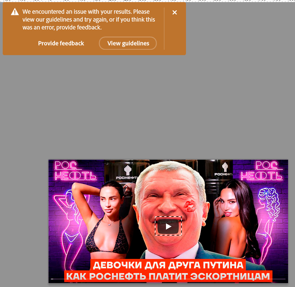 (Прикольно, Photoshop отказался удалять значок YouTube посреди хари Сечина - сказал, что против правил. Я убрал значок YouTube, оставил просто белый прямоугольник. Тоже отказался обрабатывать. У Photoshop с Сечиным, я так понимаю, любовь.)