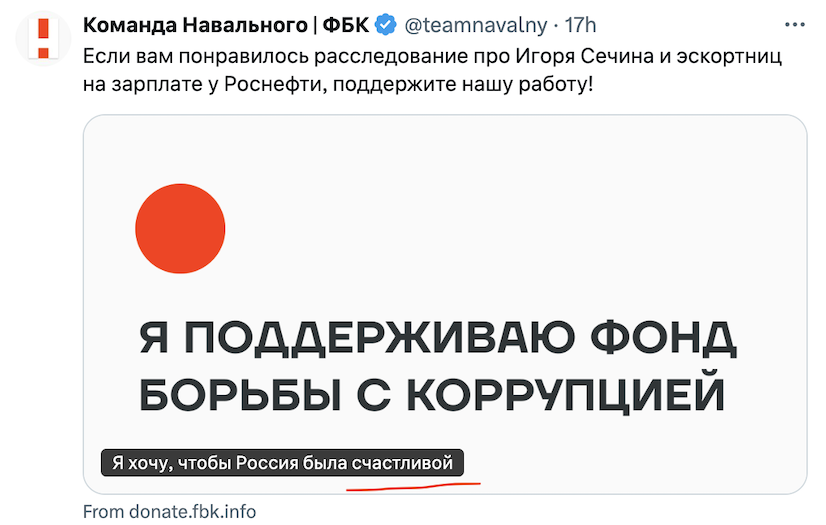 Ребята, 99% населения России даже не знают, кто такой Сечин. А во время кровавой войны, где на машины российские военные собирают чуть ли не через СМС-ки, а в госпиталях РФ не хватает буквально жгутов и зелёнки, рассказ о том, как жирует путинская элита, — это абсолютно классический и верный способ расширять недовольство среди населения. Причём сейчас это имеет и прагматический эффект по отношению к войне. Чем больше ненависти к путинской элите у «обывателя», тем меньше шанс, что он пойдёт на фронт или отпустит туда своего близкого.