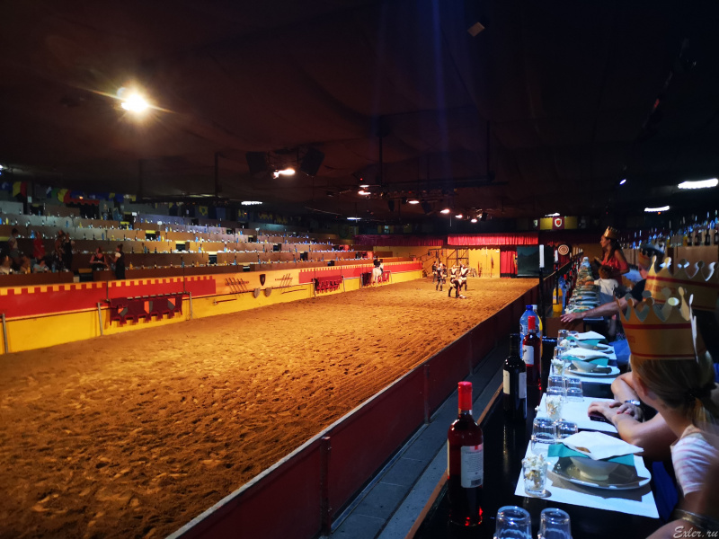 На втором этаже - арена для выступлений рыцарей, зрители сидят за столами, на которых расставлены бутылки с вином и напитками. Перед теми, кто оплатил полный ужин, стоит глубокая тарелка, рядом с которой лежит здоровенный кусок хлеба. Когда начнется шоу, в тарелку нальют похлебки. Приборы не дают - в средние века приборами не пользовались. После супа принесут половинку курицы на гриле и половинку здоровой картофелины.