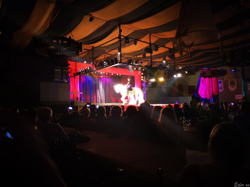 Был на этом шоу в 11 году. Там сценарий был другой: четыре рыцаря сражались между собой за какой-то приз (бои на мечах, попадание копьями в мишени и т.п.), но потом, ещё до того, как определился победитель, пришёл мерзкий колдун и украл приз. Тогда рыцари объединились, пошли отобрали приз у колдуна с его приспешниками и по-братски поделили. И тоже зрителям в зависимости от места назначали, за кого из рыцарей болеть. Двух из тех рыцарей я узнал на фотографиях в этой статье.