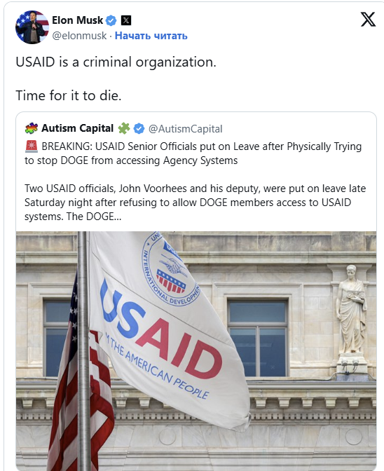 Шумиха с приостановкой деятельности американского агентства USAID поднялась нешуточная. Насколько я понял, это агентство не закрыли, но приостановили его деятельность с целью выяснения того, что именно они финансируют и как. Суммы там серьезные - насколько я читал, это агентство распределяет за год 40 миллиардов долларов.