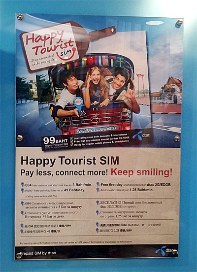 В аэропорту Бангкока висят самые разнообразные плакаты, рекламирующие данный вид симок от компании Dtac, которые выпускаются специально для туристов.