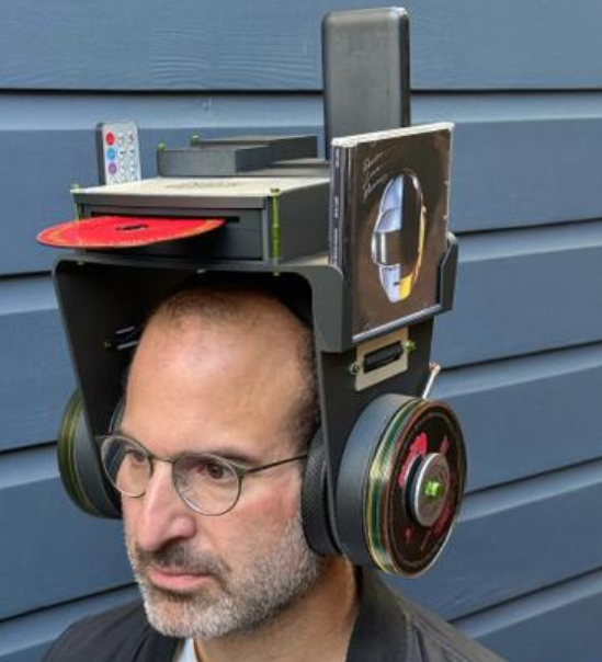 "Компания Pud представила уникальную аудиосистему, объединяющую беспроводные наушники и CD-проигрыватель в едином устройстве, носимом на голове. Новинка решает проблему мобильности при прослушивании компакт-дисков, устраняя необходимость в отдельных чехлах и сумках для аудиооборудования." (Мать моя...)