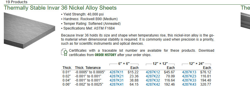 www.mcmaster.comНе знаю, сколько они сдерут, но инвар-кирпич такого размера несколько тыс баксов. Меньше $10k точно, помню, детали для микроскопов из цельных кусков EDM вырезали.