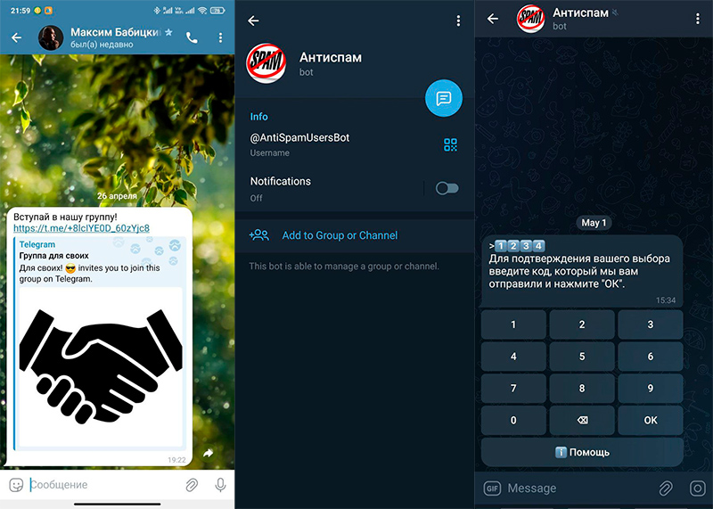 4) Бот просит подтвердить, что вы человек и ввести одноразовый код.