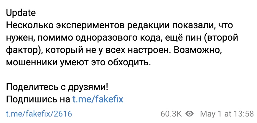 > Несколько экспериментов редакции показали, что нужен, помимо одноразового кода, ещё пин (второй фактор), который не у всех настроен. Возможно, мошенники умеют это обходить.