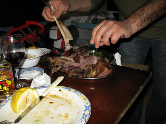 Одно из главных фирменных блюд заведения - голова барана или козла. Блюдо, прямо скажем, очень экзотическое, потому что начинать есть его нужно с глаз. И мы не рискнули. Зато остального мяса поели от души. Вот фотоотчет.