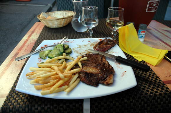 Вчера были в Арле, гуляли по городу. Образовался у меня часок поужинать. Специально нашел маленький ресторанчик не на туристской улице - заведение, где едят местные. Меню простенькое и только на французском. Но я слово entrecote на любом языке знаю, поэтому решил, что разберемся.