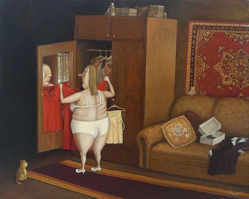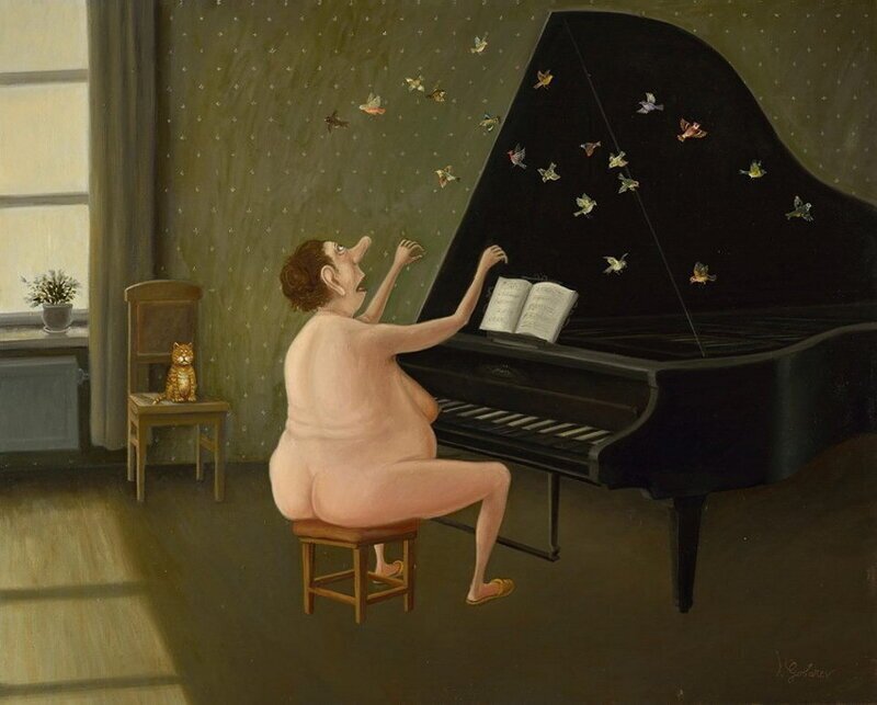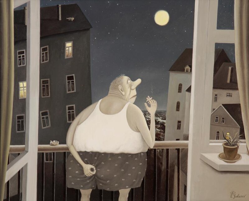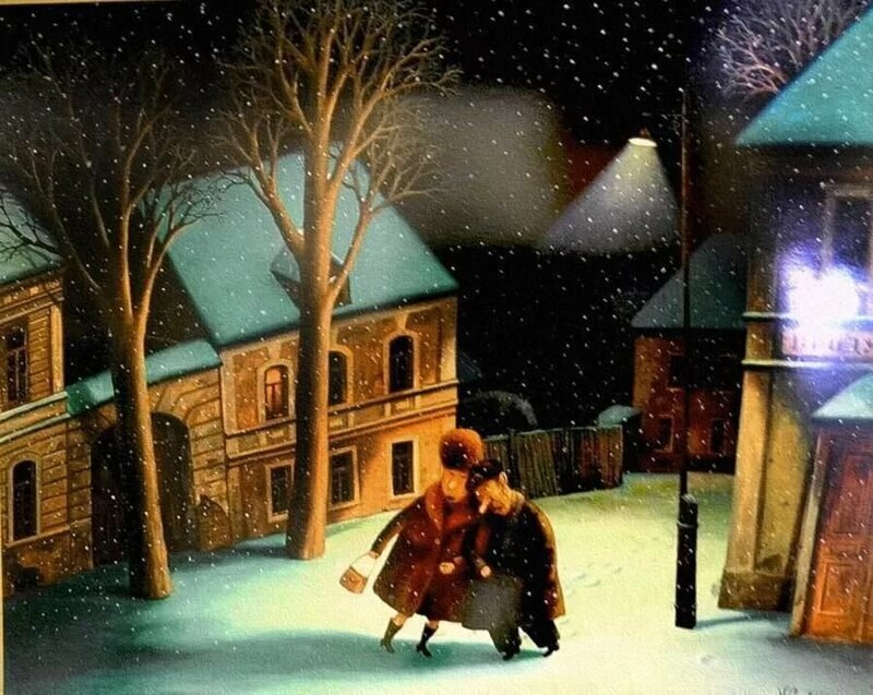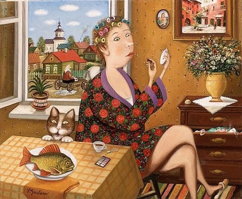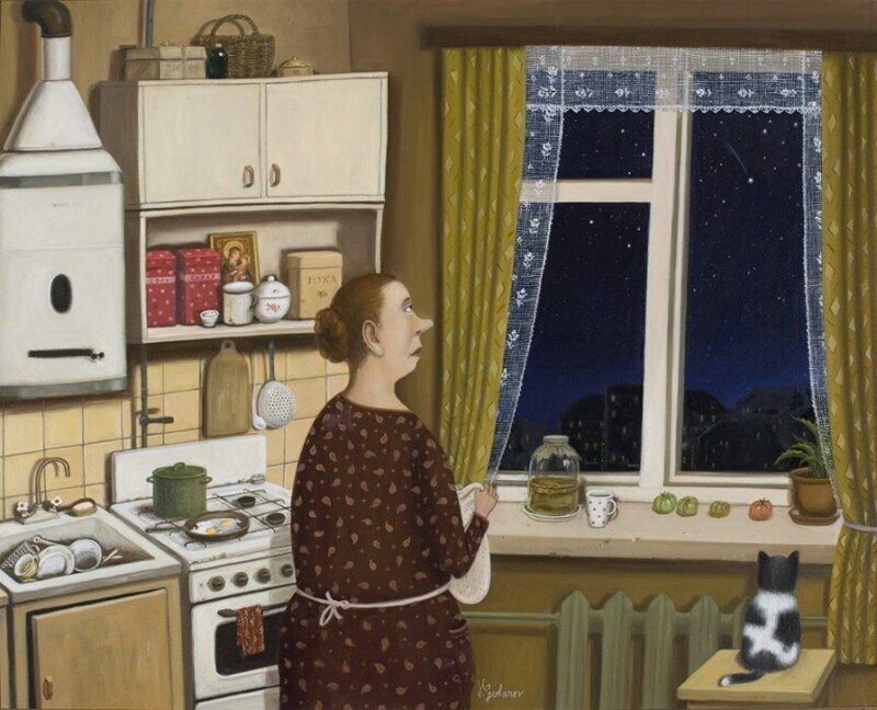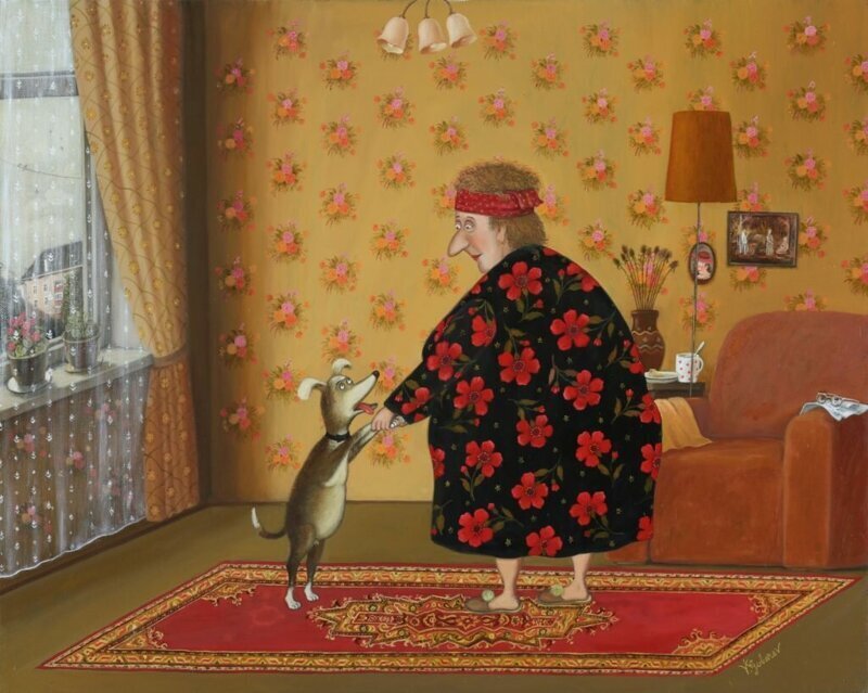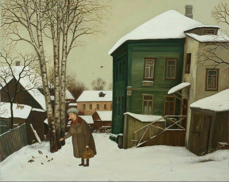 Мне его картины очень нравятся, есть в них какое-то очарование (публикуются отсюда). Самая последняя картина получила отдельный приз зрительских симпатий кота Бублика.
