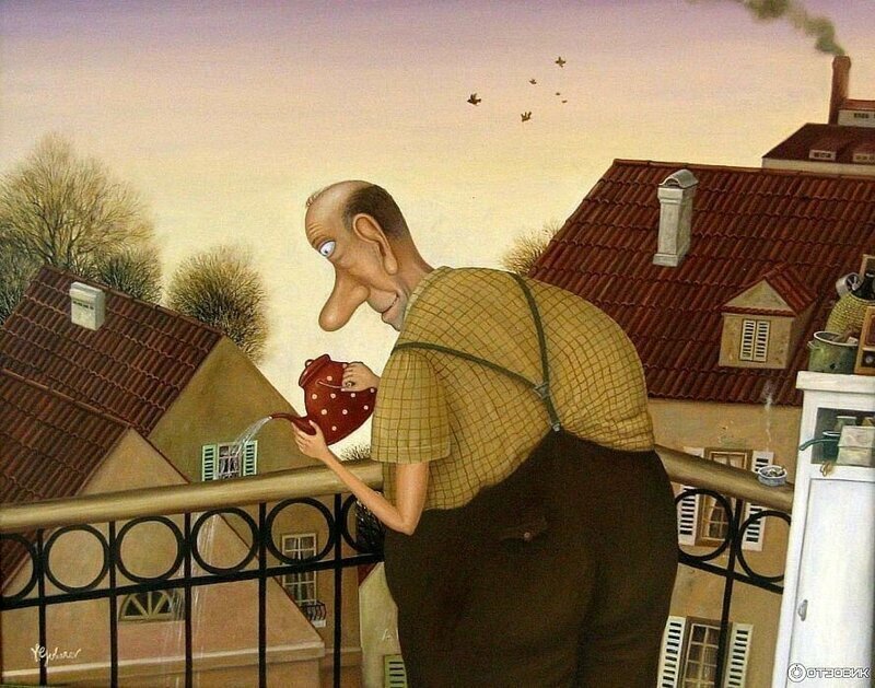 Не понял чего поливает мужик с балкона из чайника . Предпоследняя картина.