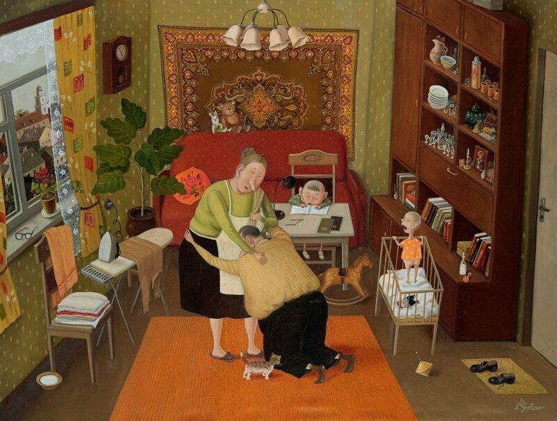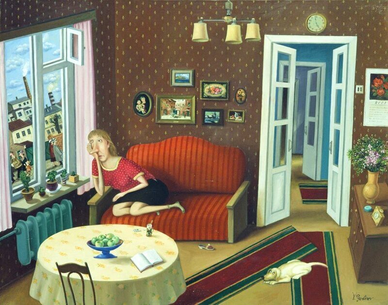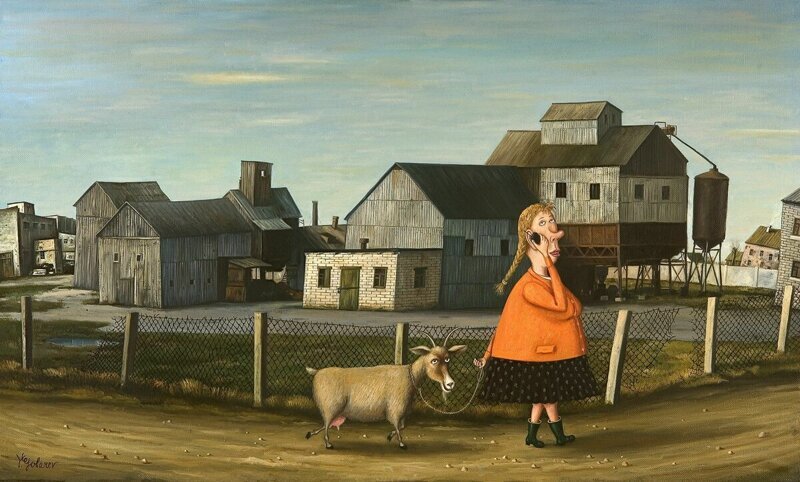 Стиль Валентина Губарева - наивный соцарт: будни людей в провинциальных городах, преимущественно советских времен.