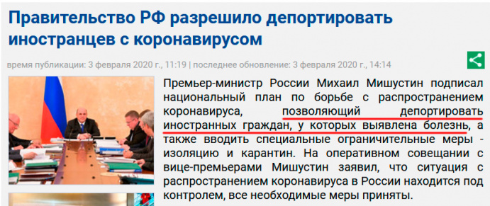 "Российские власти заявили, что места депортации из России тех иностранцев, у кого подозревают коронавирус, будут определены позднее. Это довольно сложная процедура, поэтому вряд ли к ней будут прибегать без явной необходимости, считает профессор НИИ вирусологии имени Ивановского Михаил Щелканов: «Ситуация вокруг коронавируса стала больше политической, нежели вирусологической или эпидемиологической. Я думаю, что если мест в инфекционных больницах будет хватать, иностранцев депортировать не станут. Я не очень понимаю этого хода, потому что это лишнее напряжение для системы биологической безопасности, транспортировка будет происходить в специальных условиях. На мой взгляд, проще было бы лечить в наших инфекционных отделениях, чтобы врачи получали соответствующий опыт. Но я думаю, что это решение “с запасом”, чтобы в случае чего у наших министерств и ведомств были развязаны руки»."
