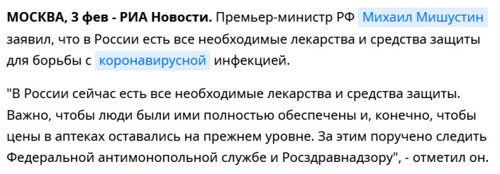 "Премьер-министр РФ Михаил Мишустин заявил, что в России есть все необходимые лекарства и средства защиты для борьбы с коронавирусной инфекцией".