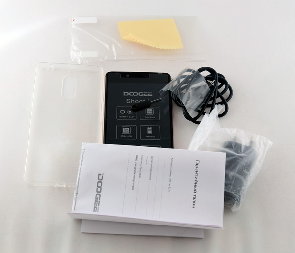 Комплект поставки: смартфон, силиконовый чехол, защитная пленка, тряпка для протирки экрана, адаптер питания, кабель USB-microUSB, руководство пользователя и гарантийный талон.