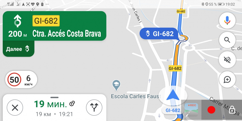 В общем, протестировал я это все на паре поездок. Тестировался мой Huawei P30 Pro. Программа навигации - Гугл.Карты, программа видеорегистрации - DailyRoads Voyager. Программа видеорегистрации после выхода из нее выводит на экран специальную полупрозрачную панель, на которой есть кнопка записи и остановки записи, а также кнопка перемещения по экрану.