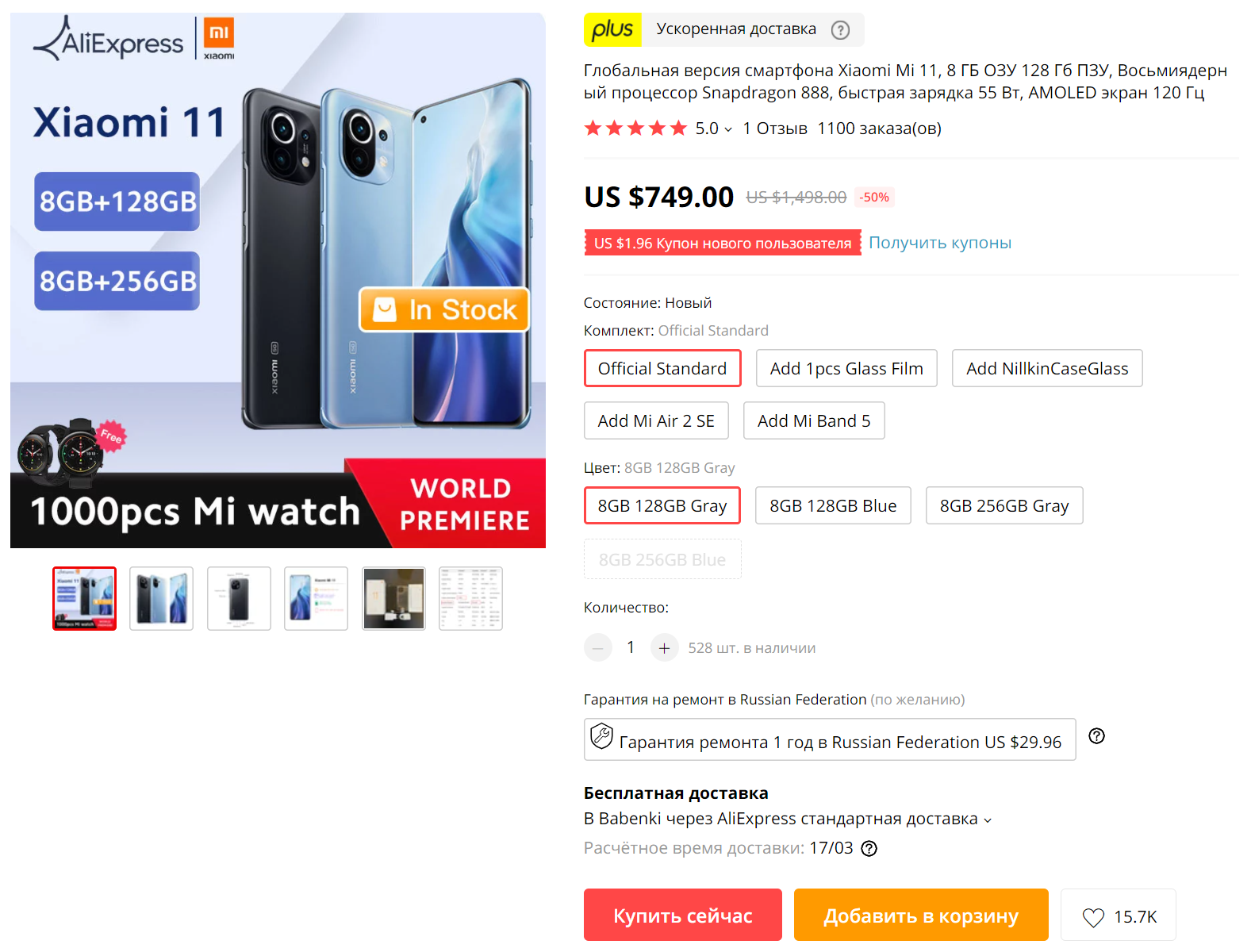 Xiaomi Mi 11 cейчас на алике продается по цене $750 с ускоренной доставкой по России.
