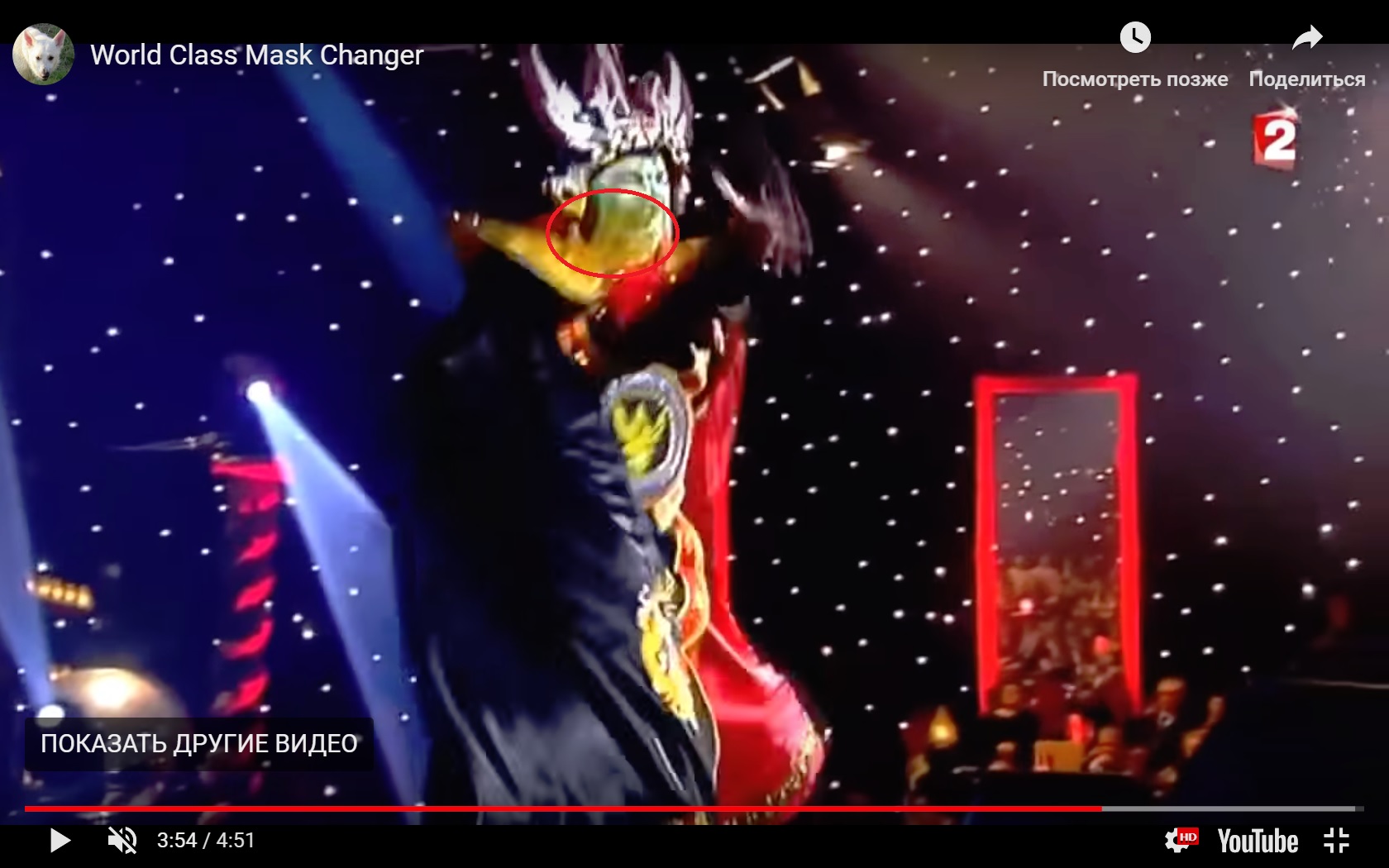 Я понял, в чём тут фокус. На этой маске меняется цвет благодаря тому, что он, видимо, или поставил смену цвета на таймер, или нажимает незаметно какую-то кнопку. То есть смена масок не происходит, происходит только смена цвета.