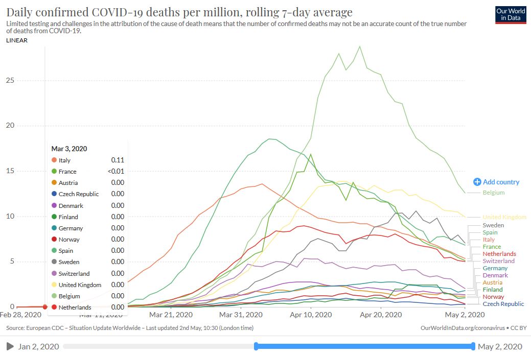 Имхо все эти споры будут вечно продолжаться. Потому что в одной конкретной стране довольно четко прослеживается снижение после введения карантина или хотя бы дистанциирования. Что и логично. Но вот при сравнении между странами уже мало что прослеживается. Слишком много факторов, сложных для измерения. Пока понятно только, что хотя бы какое-то социальное дистанциирование необходимо - к этому все рано или поздно приходят. Но нужен ли полнейший локдаун или хватит и более легкого варианта (а-ля Нидерланды) - это уже сложно сравнивать, и каждая страна по ситуации придумывает.