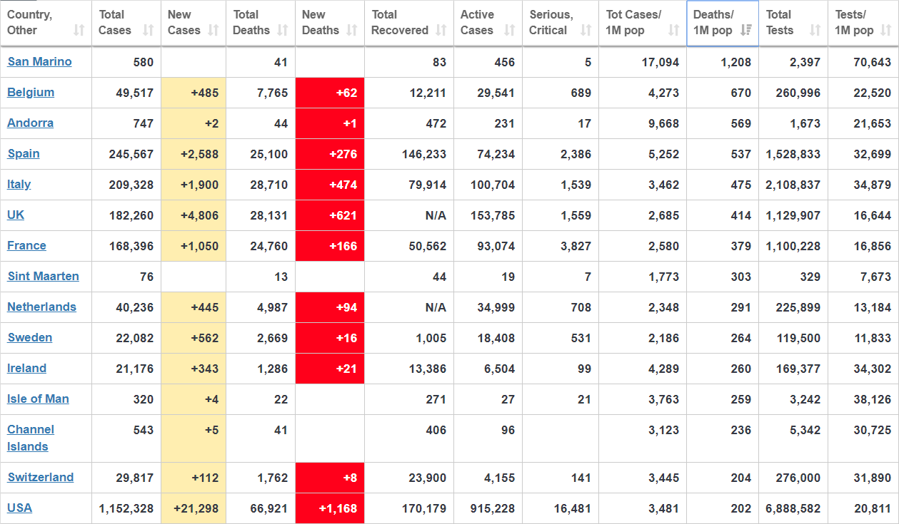 Периодически в комментах всплывают утверждения о том, что, мол, "в Швеции смертность от коронавируса дикая, намного больше, чем в других странах". Что уже звучит странно, потому что смертность от коронавируса (штука в известной степени очень условная, потому что сейчас на счет коронавируса засчитывают практически любые смерти) - она как раз от наличия или отсутствия карантина, как мне кажется, не зависит вообще. Она зависит от состояния медицины. В Швеции при отсутствии карантина никакого перегруза медицинских учреждений (главная цель введения карантина - избежать перегруза больниц) не наблюдается. Да и со смертностью, если просто посмотреть на табличку, она тоже как-то совсем не в самых первых рядах. Швецию обгоняют: Испания, Италия, Великобритания, Франция, Бельгия, Нидерланды. При этом в данных странах, в отличие от Швеции, жесткий карантин. По количеству смертей Швеция от Испании, Италии, Великобритании и Франции отстает ровно на порядок.Как и по количеству зараженных. Оно понятно, конечно, что население в этих странах количественно разное, но можно посмотреть и относительные цифры.