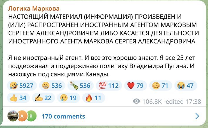 Вот вы смеётесь, а может Марков - первый настоящий иноагент, который не за антивоенную позицию в список попал, а за то, что какие-нибудь азербайджанские или какие ещё организации ему за пиар забашляли.