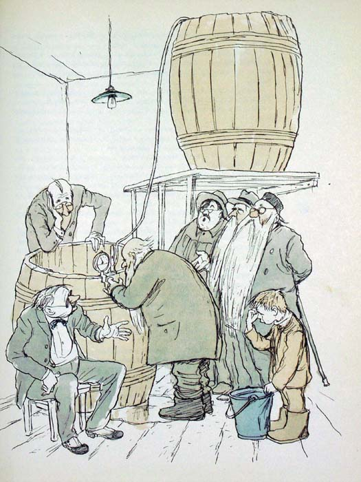 "Когда вся жидкость переходила из верхнего сосуда в нижний, в производственное помещение являлся мальчик в валенках. Не по-детски вздыхая, мальчик вычерпывал ведром жидкость из нижней бочки, тащил ее на антресоль и вливал в верхнюю бочку. Закончив этот сложный производс твенный процесс, мальчик уходил в контору греться, а из клистирной трубки снова неслось всхлипыванье,жидкость совершала свой обычный путь — из верхнего резервуара в нижний."