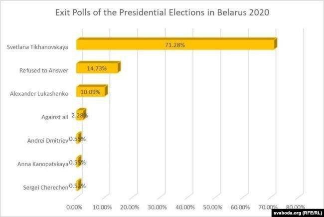 По экзит-поллам победила Тихановская с результатом около 70%.