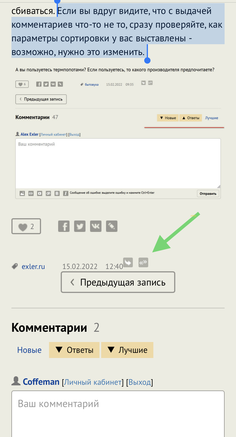 Так как иногда приходят письма с сообщением о том, что порядок выдачи комментариев на сайте внезапно и трагично поменялся, напоминаю всем, что сортировку комментариев вы задаете сами - справа от слова "Комментарии" расположены кнопки вида и направления сортировки. Я обычно сортирую от новых к старым, а ответы - наоборот: от старых к новым. Также можно сортировать по "Лучшим" комментариям (это которым поставили больше всего плюсиков).
