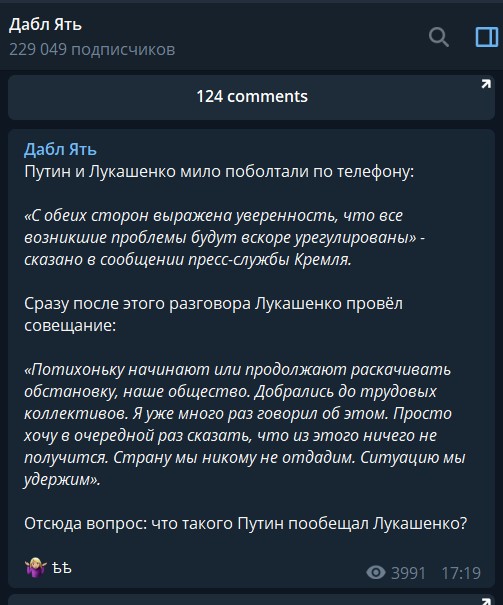 Да нет, на Медузе пишут, что они вполне себе поговорили, дружески, так сказать, все слова поддержки высказаны, и, наверное, советы и обещания помощи. Я вообще несколько удивлен, почему то, многие думают, типа Путин хочет слить Лукаша, или, во всяком случае, не против этого. Ясное дело, он против. С Лукашом ему вполне комфортно, он его знает как облупленного, и что Лукаш от него по любому никуда не денется, тоже знает. Смешно думать что Лукаш мог бы вдруг взять курс на Запад и попытаться как то отвязаться от "братской опеки". Лукаш без России и, конкретно Путина, никто и звать никак. А скинут Лукаша, придет какой нибудь там Бабарико, нет, украинского варианта конечно не будет, но и прежнего партнерства можно не ждать, Беларусь мягко, но постепенно будет скользить по направлению к Европе. Путину такое даже представить невыносимо, это ж, по сути, его последний европейский плацдарм. Так что нет, к сожалению так просто это все не завершится скорее всего.. Если "братская рука" почувствует что для Лукаша дело действительно пахнет керосином, то постарается вмешаться в процесс, так или иначе.