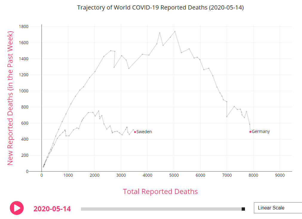 А вот со Швецией всё совершенно непонятно, состояние подвешенное. Куда дальше пойдёт график, вверх или вниз – не могут сказать даже сами шведы. И это всё притом, что даже на этом этапе "неопределённости" Швеция уже потеряла в 3,5 раза больший процент населения, чем Германия. То есть, показатели уже хуже.