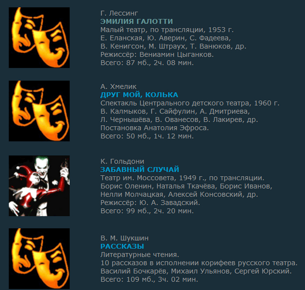И действительно, совершенно бесплатно и безо всяких регистраций вы там можете скачать знаменитые советские радиоспектакли, которые в те времена готовились очень тщательно и озвучивались знаменитыми театральными актерами.