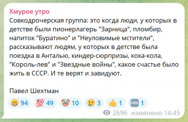 Я много раз это наблюдал. Как начинают рассказывать какие-то сказки про советский концлагерь, так сразу заглядываешь в профиль - а там минимум восьмидесятые-девяностые года рождения. И если вдруг среди них попадается кто-нибудь из шестидесятых-семидесятых, то это дочки-сынки каких-нибудь шибко партейных руководителей, семьи которых, конечно, жили совершенно по-другому - не так, как мы, очень недорогие советские граждане. И это, заметьте, я еще - москвич и из вполне благополучной семьи. Но я хорошо помню, что собой представлял этот очень лицемерный, опутанный по границам колючей проволокой и конкретно нищий (потому что Госплан и гонка вооружений) Совок.