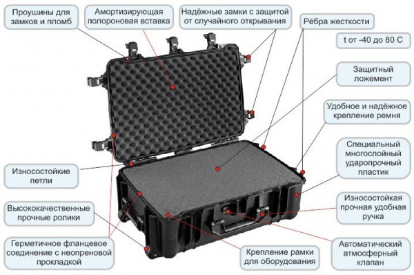 При этом отличительной особенностью таких пластиковых кейсов является наличие специального воздушного клапана, который либо герметично закрыт, либо в операционном состоянии автоматически выравнивает давление внутри кейса в соответствии с атмосферным. Это позволяет избежать лишних деформаций корпуса при изменении внешнего давления и облегчает открывание при высоком атмосферном давлении.