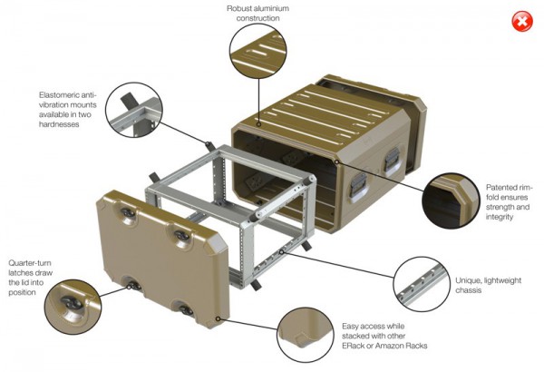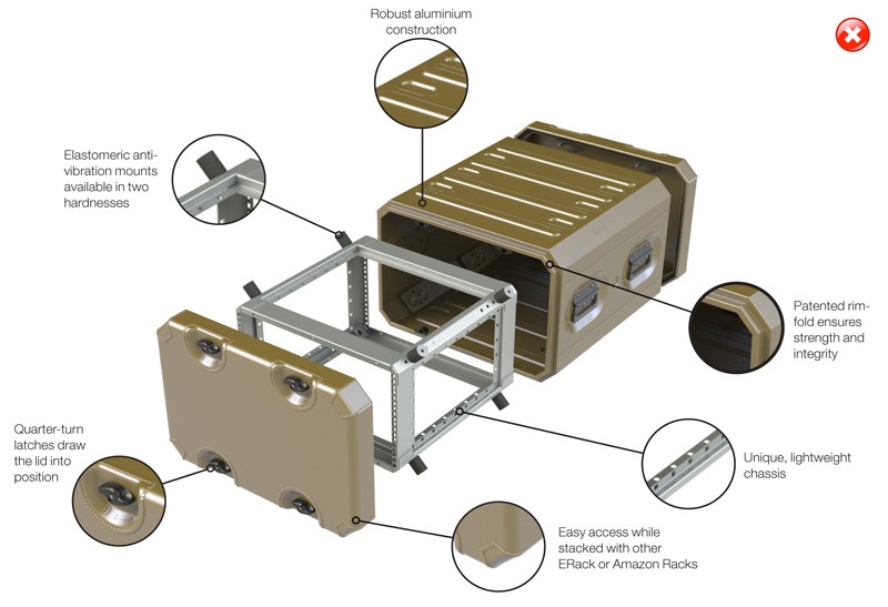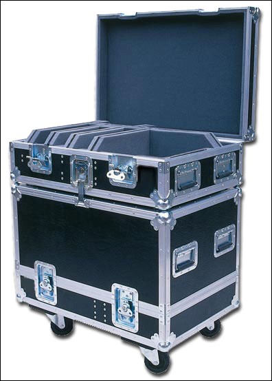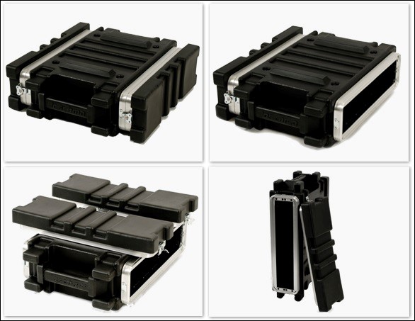 Третий тип защитных кейсов — это рэковые кейсы или рэки, от английского слова rack, что означает «стойка, подставка». Такого рода контейнеры имеют внутри специальные стойки в виде объемных рамок (или ложементов). Они либо выполнены заодно с корпусом кейса, либо представляют собой отдельную деталь, которая может быть смонтирована на подпружиненных или изготовленных из какого-либо эластомера аммортизаторах.