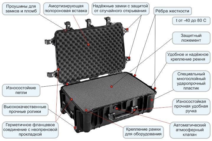 Корпус такого кейса выдерживает положительные температуры до 450°С без вреда для конструкции. Что касается отрицательных температур, то их порог строго не определен, то есть они безопасны вплоть до абсолютного нуля (-273°С).