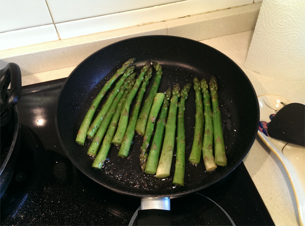 Спаржа. Раньше я покупал не слишком толстую зеленую спаржу и обжаривал ее на сильном огне на оливковым масле с чесноком (обычно масло просто настаивается на чесноке), перцем и солью порядка 15 минут.