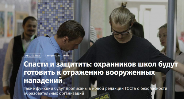 Охранников школ и других образовательных организаций будут готовить к отражению террористических угроз и вооруженных нападений. Об этом говорится в новом проекте ГОСТа, который имеется в распоряжении «Известий». Как считают его авторы, это поможет предотвратить повторение инцидентов, связанных с вооруженными нападениями на образовательные организации. Инициативу поддерживают в комитете Госдумы по безопасности, где считают, что такие новые стандарты должны стать обязательными для всех образовательных организаций. (Отсюда.)
