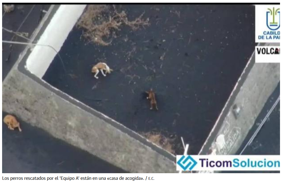 Что известно на данный момент? Собаки принадлежали неким охотникам (в Испании и на Канарах охота - очень популярная тема), которые охотились в этих краях. Когда началось извержение, собаки, испугавшись грохота, убежали. Охотники не имели права входить в эту опасную зону, однако они решили все-таки спасти собак, для чего разработали целый план: они отправились на операцию ночью, снабженными тепловизорами, с помощью которых определяли, где вообще можно пройти. В результате дошли до бассейна с собаками, вытащили их и забрали животных с собой.