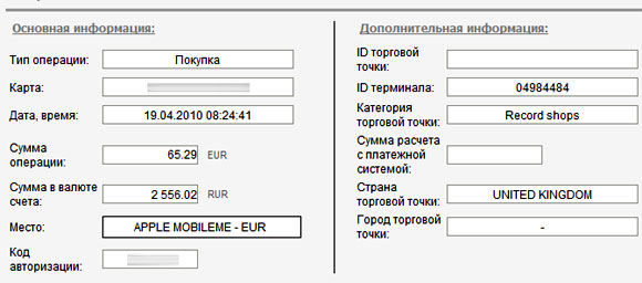 Проверил в iTunes Store свой аккаунт - не было там такого платежа. Ну, значит, точно сперли данные карточки. Кстати, у меня это в первый раз, хотя я пластиковые карты активно использую лет десять что в офлайне, что в онлайне.