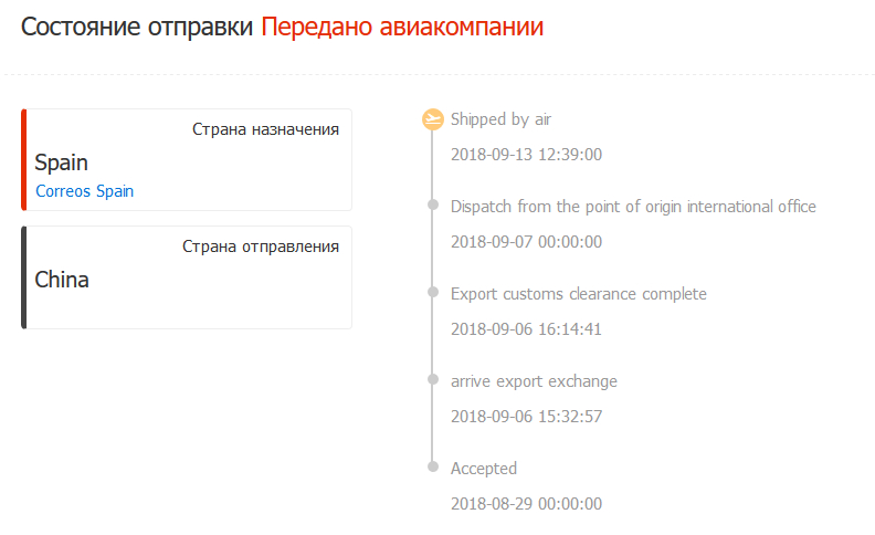 И, кстати, фраза -Shipped by air- не означает, что он прибыл в Испанию, а означает только, что его отправили авиапочтой. А вот куда и в какой центр сортировки это никто не знает. Учим язык.