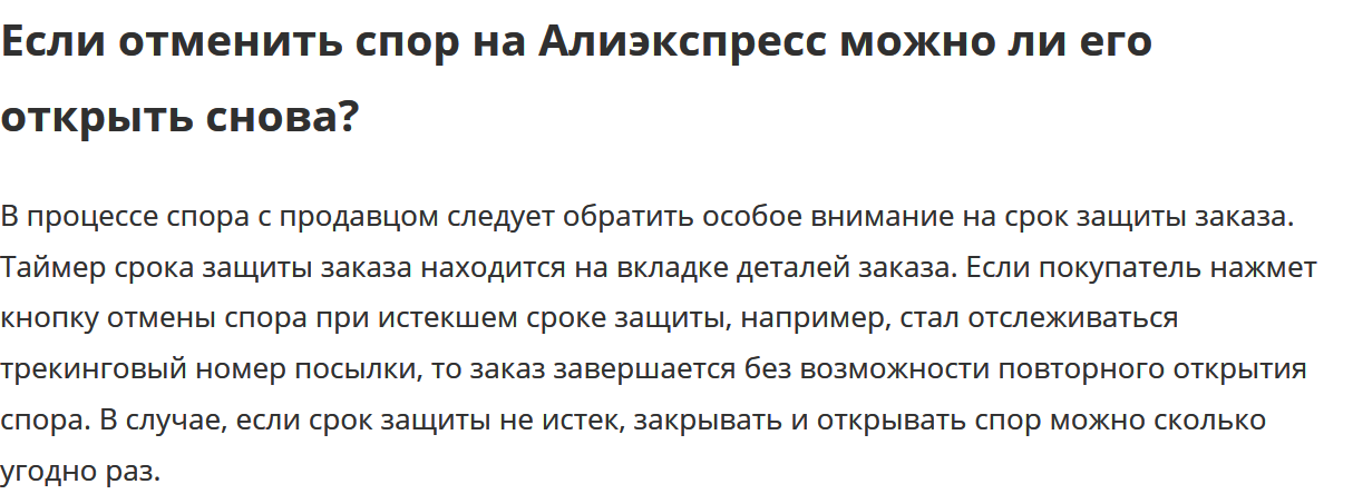 Теперь вопрос. Подождать я могу - непринципиально. В заказе срок перед требованием вернуть деньги сейчас стоит на 7 ноября, то есть еще почти месяц. Если я сейчас этот спор закрою, то ведь открыть его в случае недоставки смогу в любое время, правильно? То есть чем мне грозит закрытие спора?