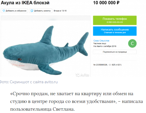 а какой смысл продавать плюшевую игрушку из икеи за миллионы рублей? люди кто-то просто "прикалывается", а кто-то с иронией такие "посты" создает.