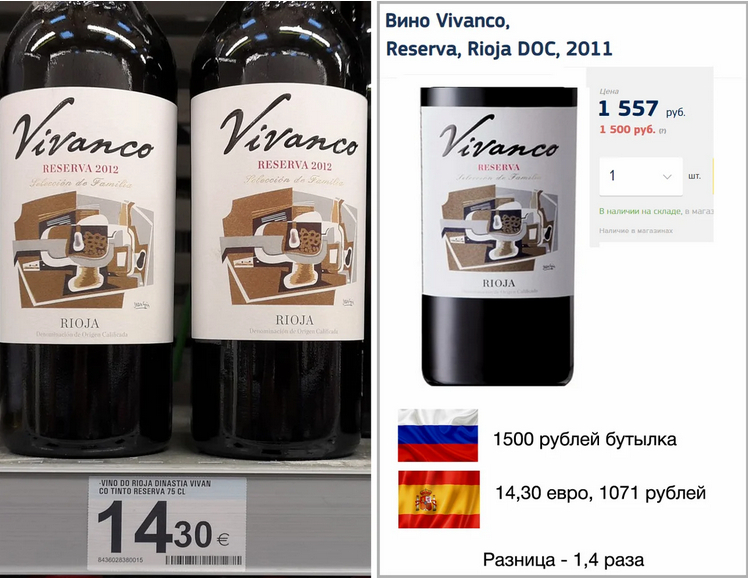 Денис Руденко не поленился и сделал сравнение цен на испанские вина в Испании и в России, чтобы опровергнуть распространенное заблуждение о том, что "в России на зарубежное вино накручивают 3-5 концов". Это уж не говоря о Свидетелях вина за 2 евро в Испании и за 20 евро в Москве.
