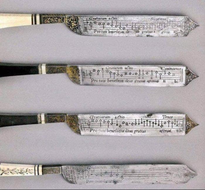 Столовые ножи XVI века с нотами на них, чтобы гости могли вместе спеть в конце трапезы. Ну чем не караоке, правильно? А еще на ноже написан голос - сопрано, тенор, альт, - так что соответствующие ножи вручались соответствующим людям.